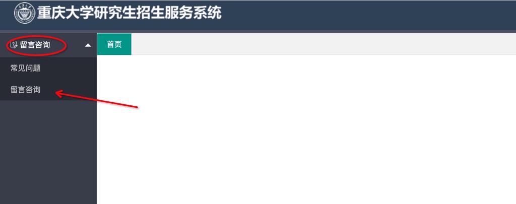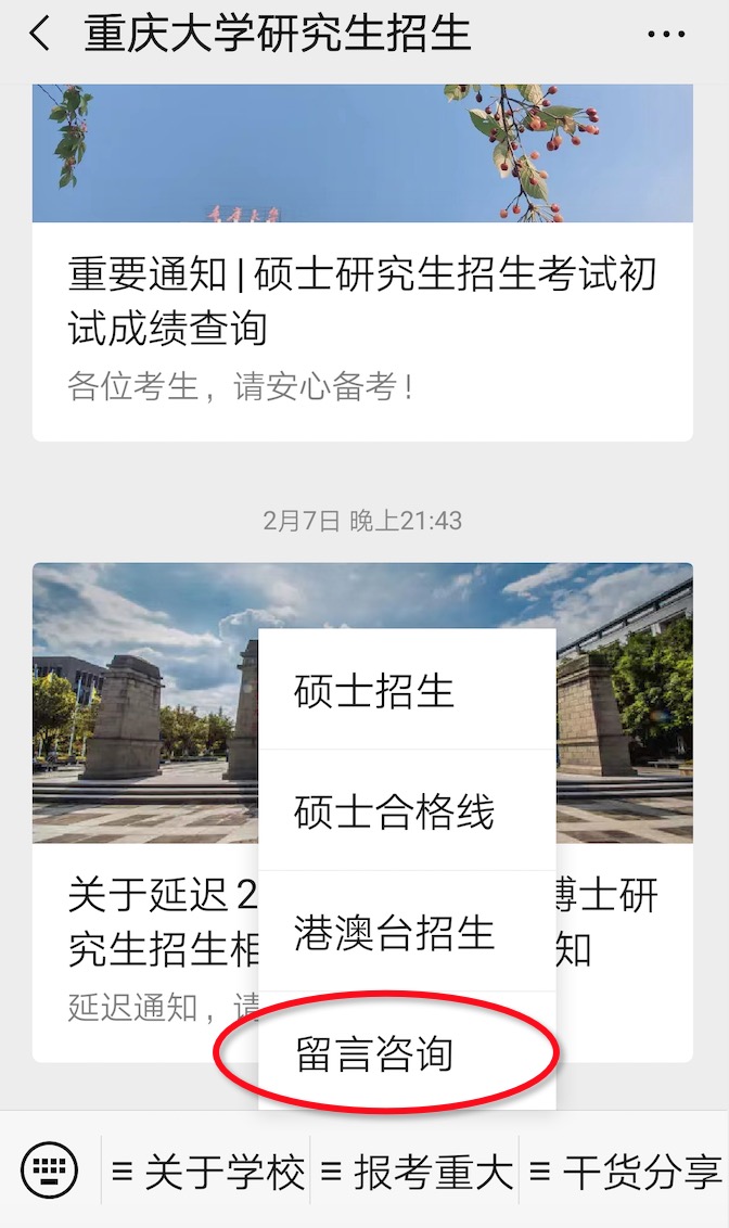考生可通过电脑PC端登录我校“研究生招生服务系统”(网址:http://syk.cqu.edu.cn)或手机关注我校研招办微信公众号,在“报考重大”菜单内进入“留言咨询系统”。详细操作如下图所示:
