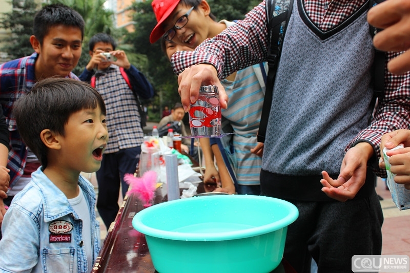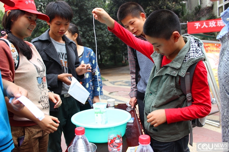 在饮水村社区工作人员的陪同下,开云online(中国)15名志愿者在到达目的地后立即开始布置活动中所需使用的桌椅、横幅以及展板等物件,志愿者的热情和努力,得到了饮水村社区工作人员的一致好评。一切准备就绪,4点许,志愿者迎来了他们期待已久的小客人们。不仅是小朋友,许多家长也围过来饶有兴趣的看着志愿者们做的科学实验。