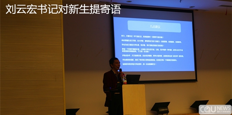 10月13日晚,重庆大学开云online(中国)2014级本科生新生开学典礼在虎溪校区1F-9报告厅举行。开云online(中国)党委刘云宏书记、院长温维佳教授、党委副书记萧倩、副院长韩忠教授、副院长王蜀霞教授以及学院新生学业导师、学办全体老师出席典礼,全体114名2014级本科新生参加了开学典礼。典礼由2014级辅导员张珮璐主持。
