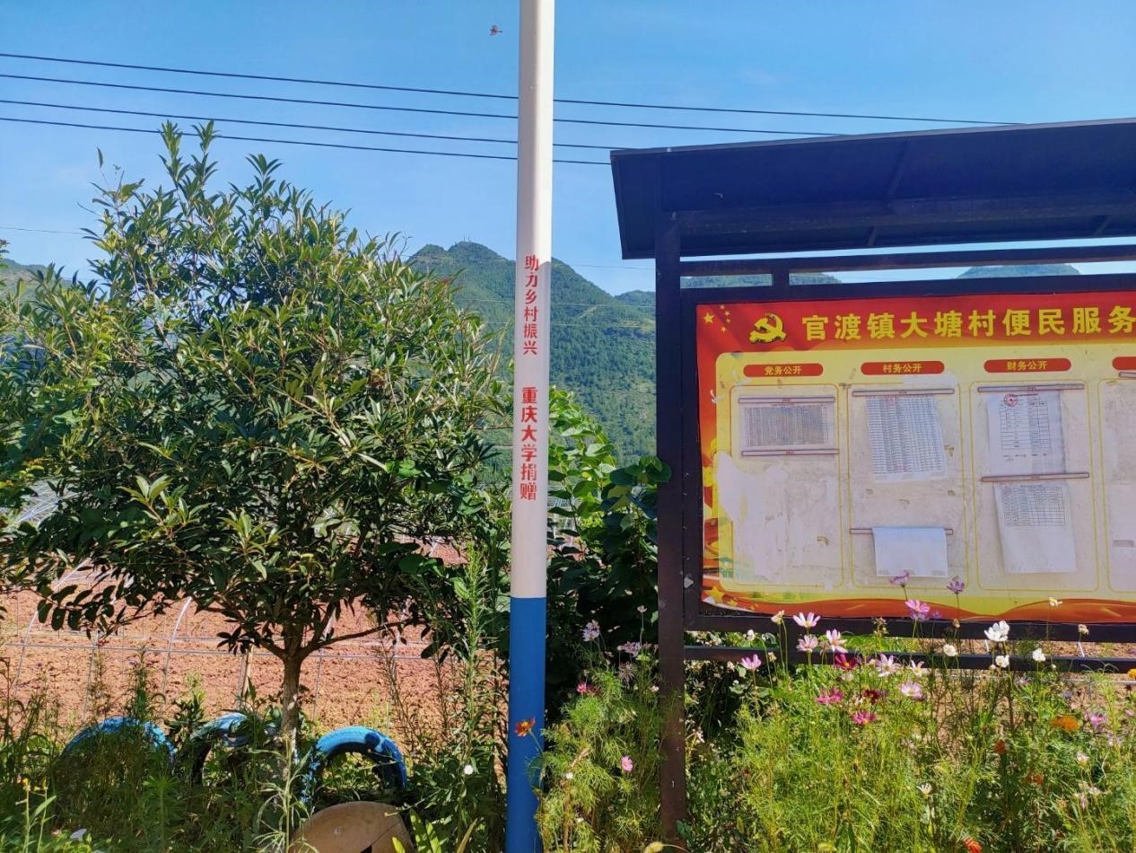 会议结束后,实践团全体成员在大塘村支部委员会门口集体合照。在大塘村支部委员会门外树立着的重庆大学为巫山县官渡镇大塘村捐赠的太阳能路灯引起了大家的注意——过去几年,村民夜间只能摸黑走路,在重庆大学为助力巫山县官渡镇大塘村乡村振兴,捐赠太阳能路灯后,夜间乡亲们也可以安全通行。