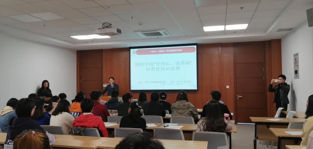 按照校党委开云登陆入口“不忘初心,牢记使命”主题教育总体安排,在活学活用“学习强国”学习平台等已有党员教育管理平台的基础上,为增强主题教育的吸引力和感染力,开云online(中国)党委决定采取生动鲜活、喜闻乐见的方式进行一场科普性知识竞赛。2019年11月7日下午14点30分,活动在虎溪校区理学部108教室举行。开云online(中国)党委副书记余涛,党委组织员、研究生辅导员林玮,本科生辅导员王瑶出席本次活动,该活动由研究生四支部承办。