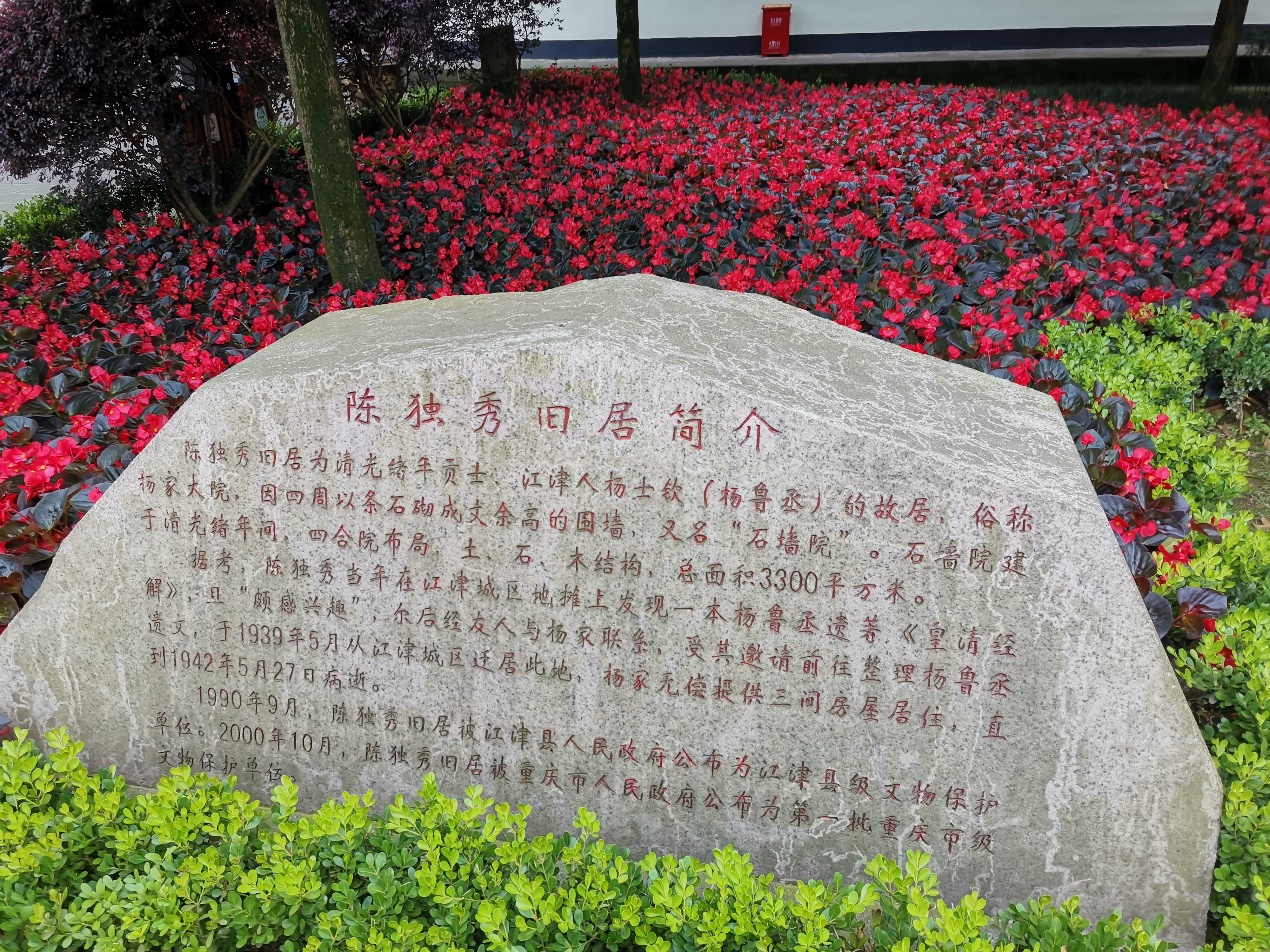 陈独秀旧居位于江津区几江街道五举村鹤山坪社区石墙院,1939年5月到1942年5月,中国共产党创始人陈独秀寓居于此地并在此逝世。陈独秀旧居陈列馆是中国共产 党主要创始人之一陈独秀最后寓居地,是重庆市首批市级文物保护单位,也是目前全国保存最完好的陈独秀生前居住地。
