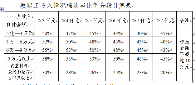 本基金资助金额根据教职工收入情况按如下(见表)档次与比例分段计算,一年累计资助金额不得超过10万元。