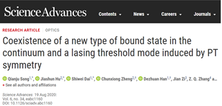 2020年8月,重庆大学韩德专研究员与香港科技大学陈子亭教授、清华大学郑春雄教授以及复旦大学资剑教授科研团队合作,从理论上构建了首个严格可解的连续谱中束缚态(Bound state in the continuum, BIC)模型。相关研究成果以《宇称时间对称性诱导出来的一类新型连续谱中束缚态和激光阈值态的共存现象》“Coexistence of a new type of bound state in the continuum and a lasing threshold mode induced by PT symmetry”为题发表在Science子刊《Science Advances》杂志上。此项工作以重庆大学为第一单位和通讯单位,重庆大学宋前举、清华大学胡嘉顺和重庆大学戴士为为共同第一作者,重庆大学韩德专研究员、香港科技大学陈子亭教授和清华大学郑春雄教授为共同通讯作者。