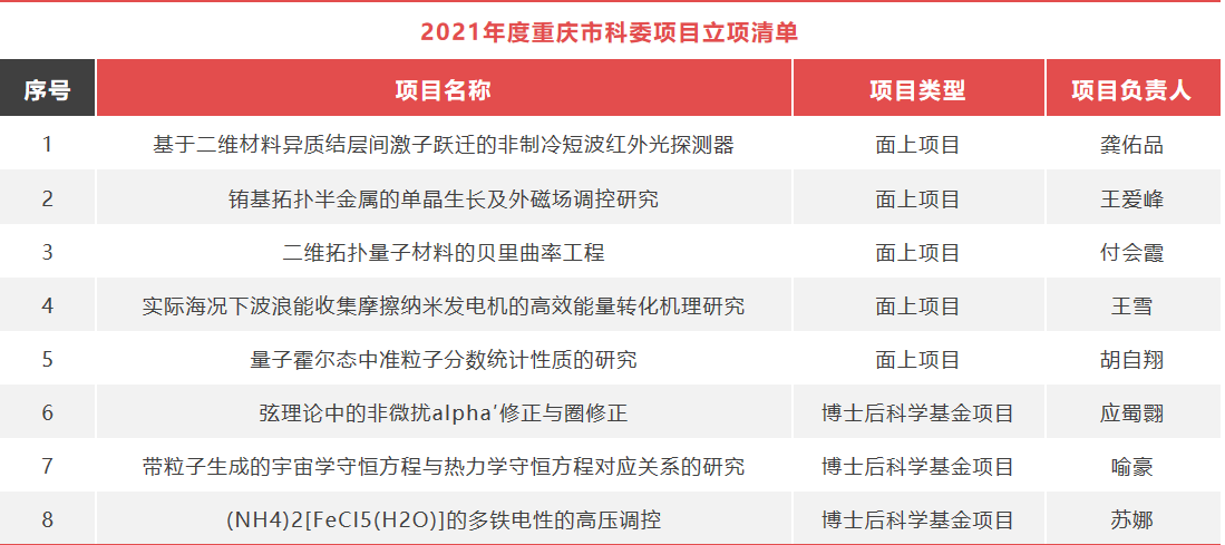 近日,重庆市科技局发布了《2021年度重庆市自然科学基金专项拟立项清单公示》,我院立项重庆市自然科学基金面上项目5项、博士后科学基金项目3项(见附表)。据悉,重庆大学共立项2021年度重庆市自然科学基金面上项目106项、博士后科学基金项目46项。
