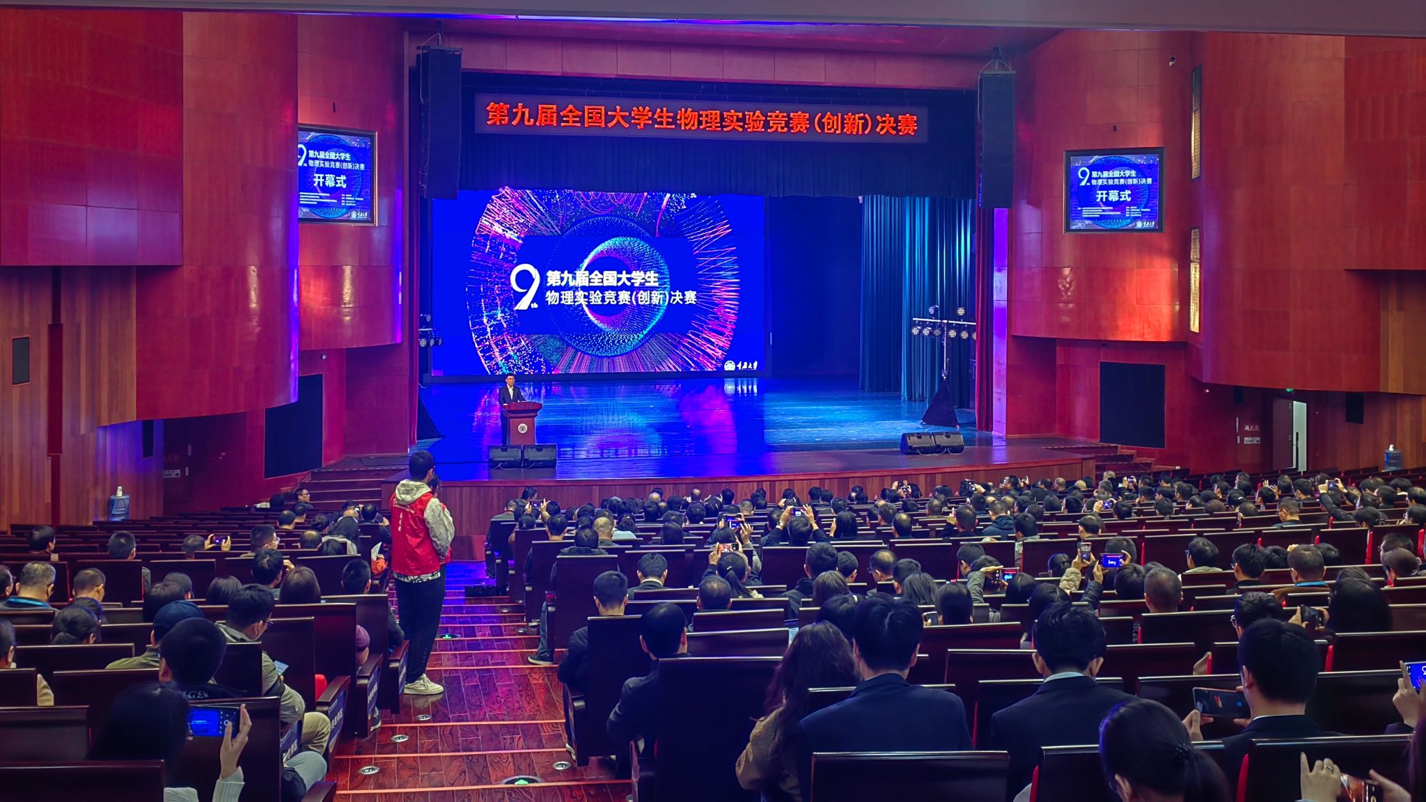 2023年11月25日上午,第九届全国大学生物理实验竞赛(创新)决赛在重庆大学虎溪校区大剧场顺利开幕。此次竞赛由国家级实验教学示范中心联席会物理学科组、全国高等学校实验物理教学研究会、教育部大学物理课程教学指导委员会大学物理实验专项委员会、中国物理学会物理教学委员会主办,重庆大学承办,《物理实验》杂志、重庆物理学会协办。来自全国231所高校近1200名学生参加比赛。