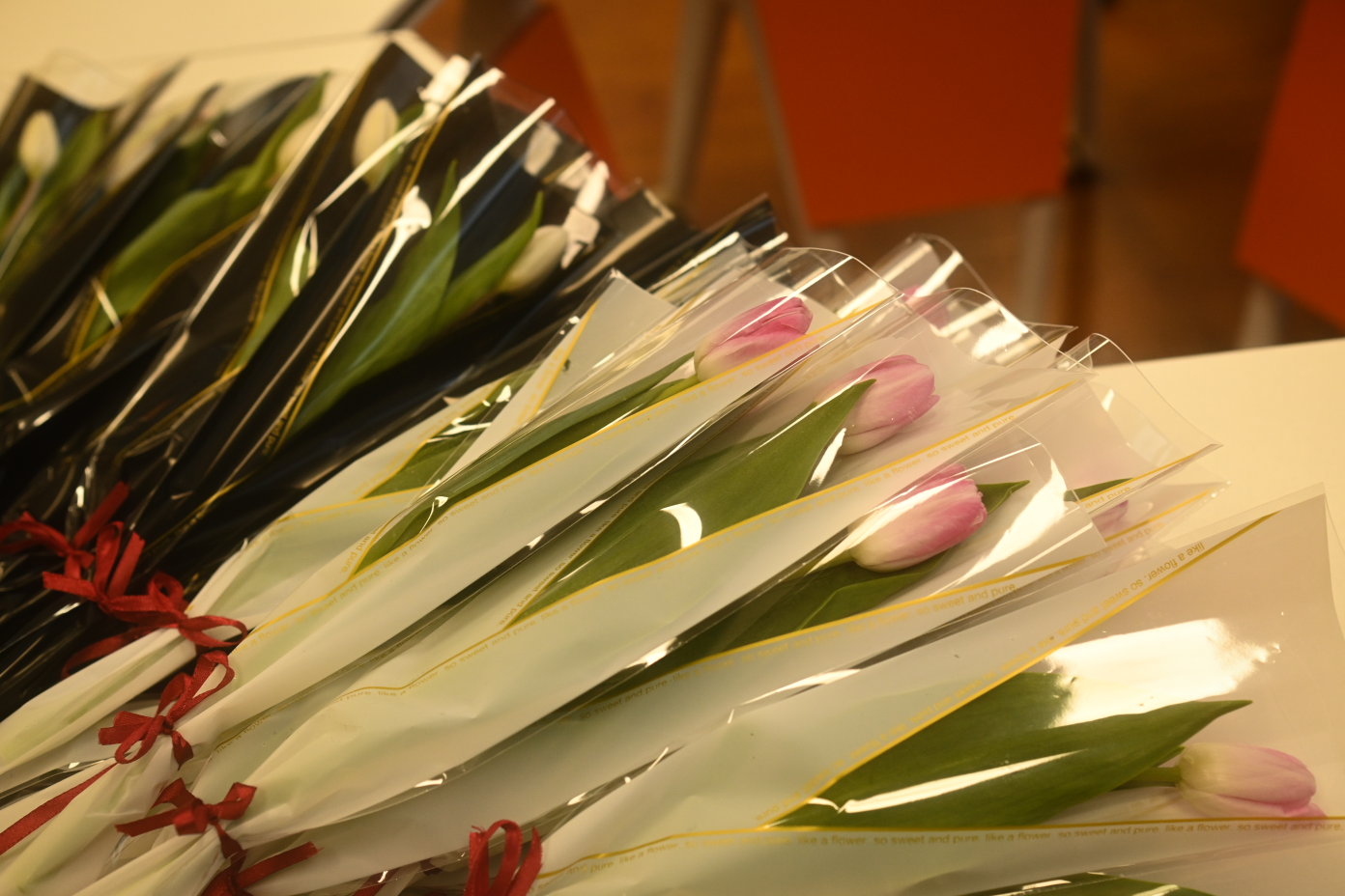 随后,大家将自己美好的祝愿书写在便签上,一张张便签拼凑出女同学们对未来生活的美好憧憬,同时学院为每位女生准备了一束精心包装的郁金香,以此表达学院对每位女生的衷心祝福。