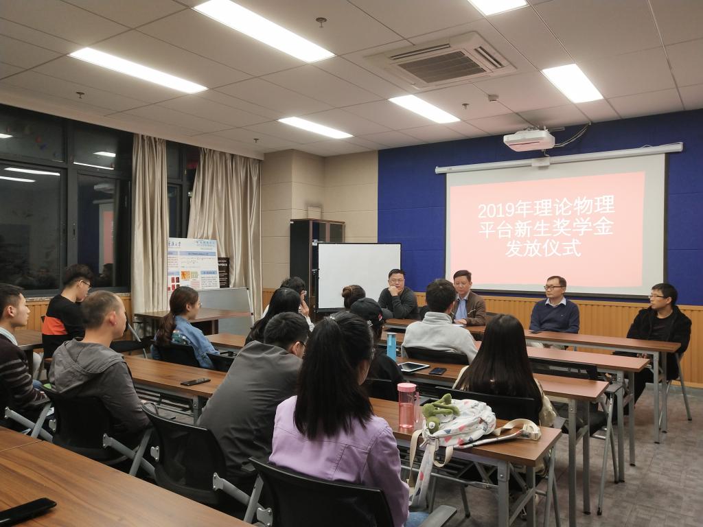 2019年10月31日,我院“理论物理平台新生奖学金”颁奖仪式在理科楼LE201会议室进行。出席颁奖仪式的老师有理论物理平台总负责人、开云online(中国)院长吴兴刚教授,平台负责人、副院长胡自翔教授,平台负责人李昕研究员、物理系系主任秦思学教授、院长助理王锐副教授;参加本次颁奖仪式的还有2019级理论物理平台的研究生新生。