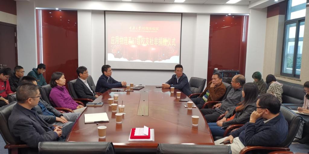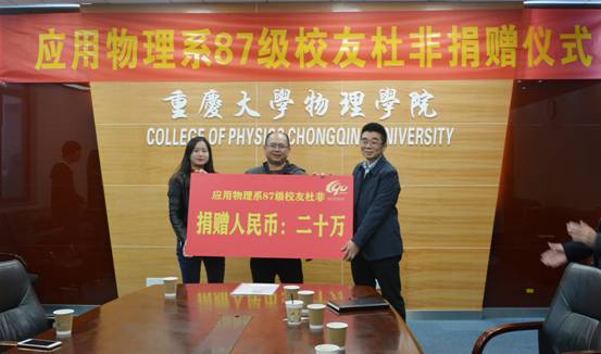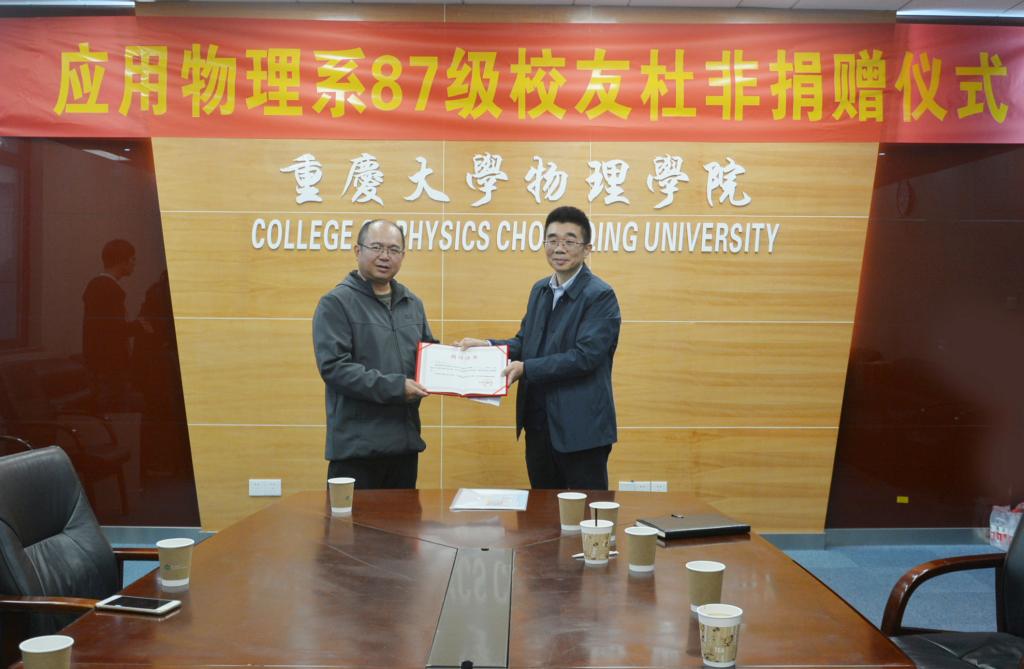 20191025日,正值重庆大学90周年校庆之际,重庆大学开云online(中国)87级校友、东莞市本量电子科技有限公司总经理杜非,向重庆大学开云online(中国)捐赠20万元。下午4点,捐赠仪式在开云online(中国)LE623会议室隆重举行,仪式由学院党委副书记余涛主持,重庆大学开云online(中国)党委书记韩忠、副院长钟小伟、副院长吴小志、副院长胡自翔,刘云宏、肖鹏、陈世建等教师代表,以及学生代表参加了本次捐赠仪式。