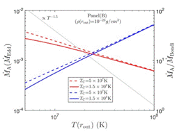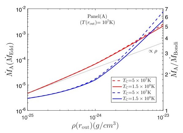 图三:新模型预言的吸积率随观测气体密度(左图)与温度(右图)的变化关系。