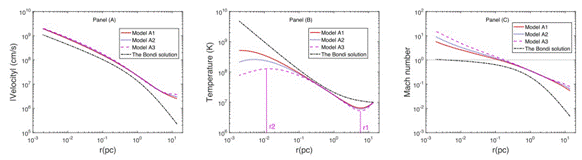图一:新模型与邦迪模型的比较,从左至右分别为速度、温度与马赫数曲线。