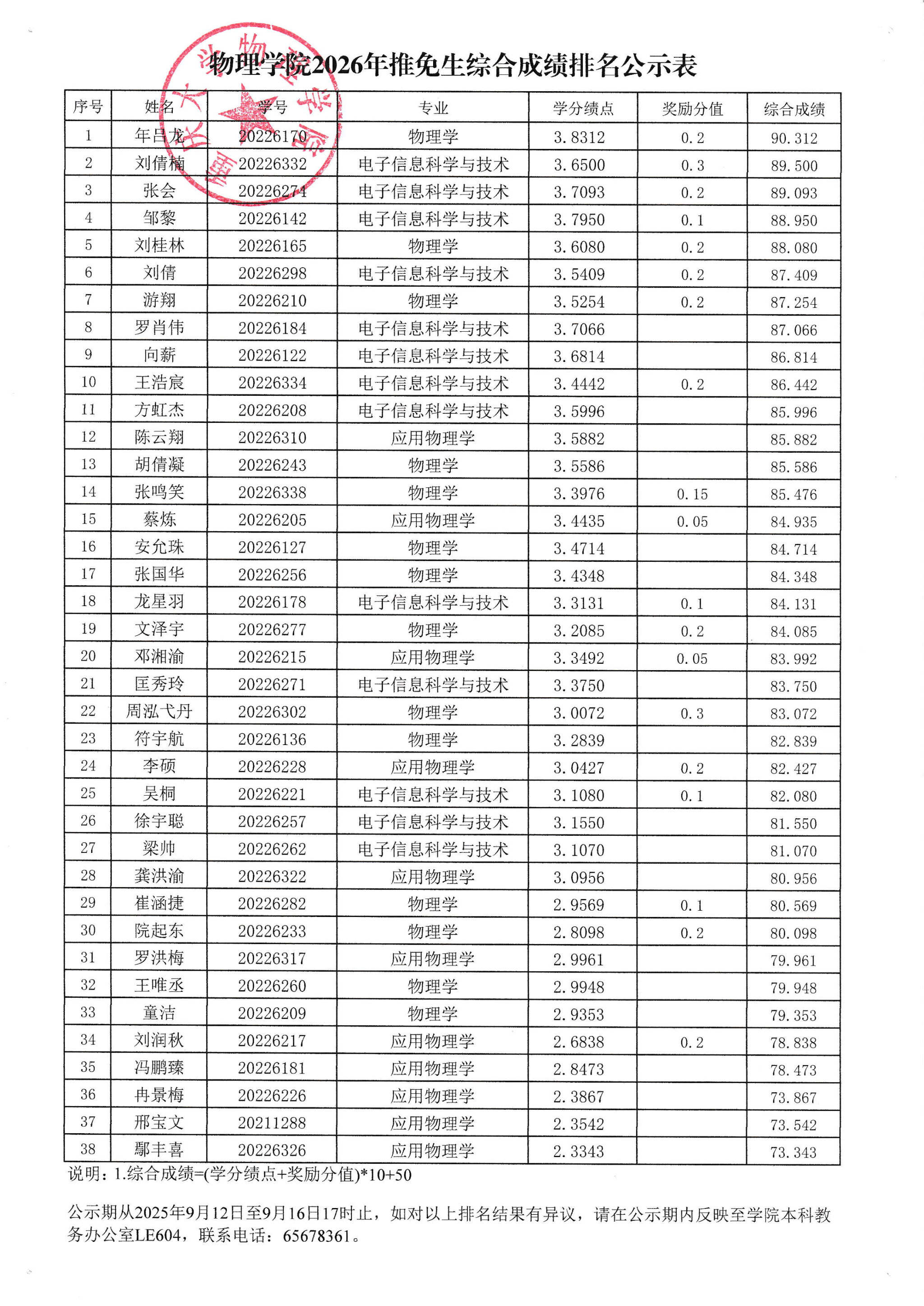 根据学校《开云登陆入口开展2026年推荐优秀应届本科毕业生免试攻读研究生工作的通知》和《开云online(中国)推荐优秀应届本科毕业生免试攻读研究生遴选工作细则》的相关规定,经过报名、初审、公开答辩程序,现将2026年推免生综合成绩排名予以公示: