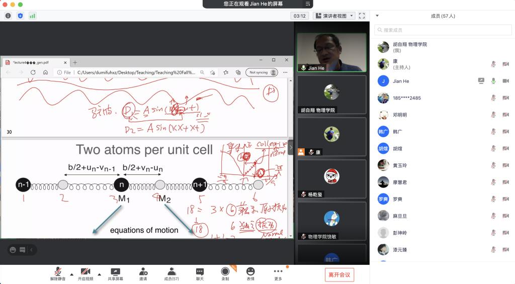 为进一步做好“后疫情时期”学生国际交流工作,夯实学生专业基础,拓宽学生国际视野,2021126日至130日,克莱姆森大学贺健教授受邀为我院师生开展线上《现代固体物理》系列讲座。讲座由周小元老师主持,通过线下和线上两种参与方式我院近100名研究生参加了此次讲座。贺健教授将固体物理的基础知识与近现代材料物理的发展特别是输运理论在实际材料中的应用相结合,主要讲解了固体物理晶格振动与晶体的热学性质、能带理论、晶体中电子在电场和磁场中运动和金属电子论四章内容。在讲座进行中,会议室秩序井然,学生提问踊跃,研讨氛围浓厚,取得了良好的学术交流效果。