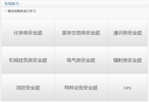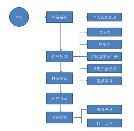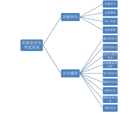 如图 1所示,本系统包括在线学习、练习测试、网上考试三大功能模块及相关管理功能,共有通识类安全、化学类安全、医学生物类安全、机械建筑类安全、电气类安全、辐射类安全、特种设备安全和消防安全 8大类安全题库,分为是非题和单选题两种题型。